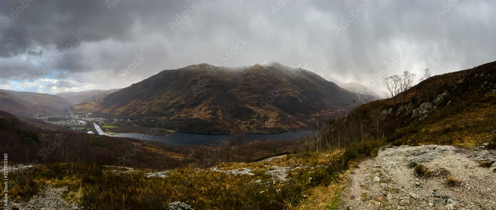 a view of loch leven and kinlochleven in the argyll region of the highlands of scotland shot from the west highland way in winter