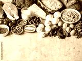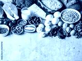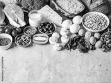 Healthy raw clean ingredients - fruits, vegetables, dairy products, eggs, legumes, dietary meat and fish, nuts and seeds on the table. Copy space.