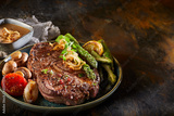 Seasoned thick grilled beef steak with asparagus