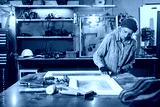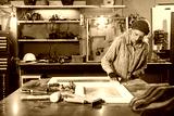 Carpenter working on the old wood in a retro vintage workshop.