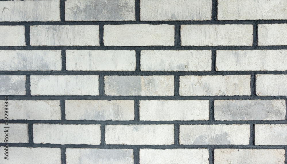 The texture of the facing bricks is white with a rough black grout for mocap. Photo of a wall lined with white bricks in the loft style. Light background in grunge style.