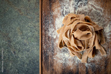 Uncooked brown pasta tagliatelle with chestnuts on a wooden Board with flour, top view and copy space