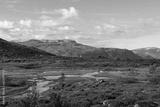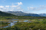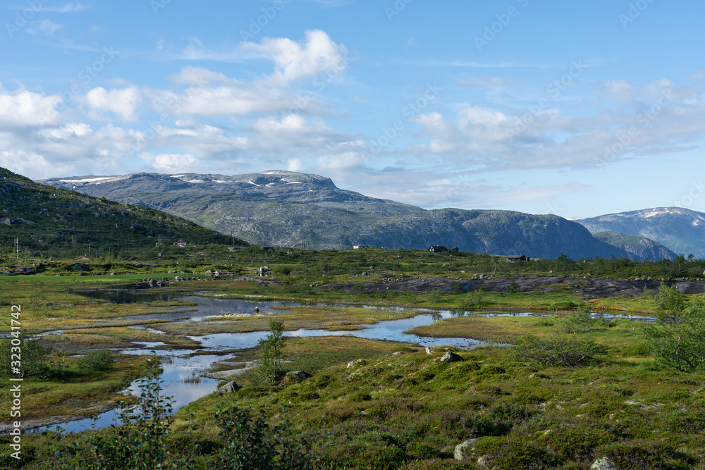 Mountain tundra green landscape view with rivulets, Norway, way to Trolltunga rock.