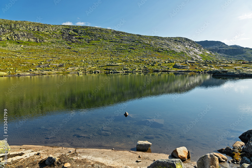Blue lake landscape, Norway. Nibbevegen road to Dalsnibba mountain from Geiranger.