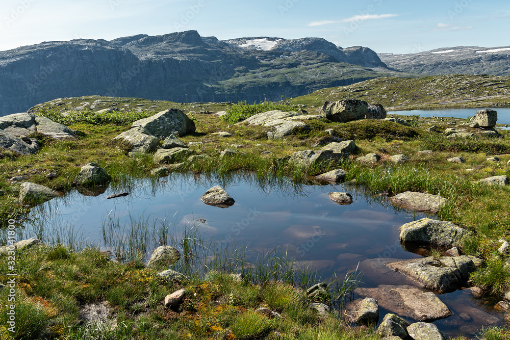 Mountain tundra green landscape view with lake, stones and rivulets, Norway, way to Trolltunga rock.