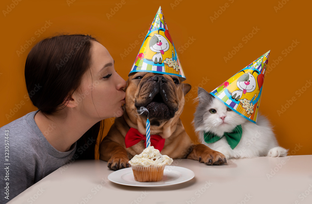 girl kisses a dog, girl with her french bulldog and cat on a yellow isolated background celebrate birthday