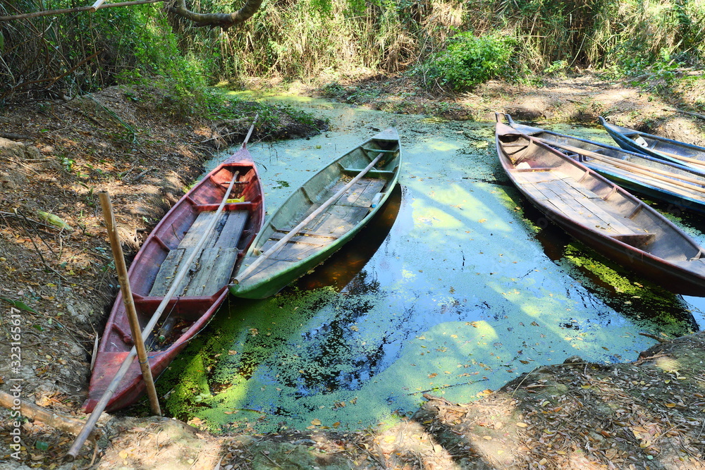 Group of small fishing boats floating along the edge of a swamp in the forest, Canoe in Thailand