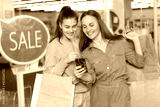 Two cheerful female friends laughing, using smart phone at the shopping mall