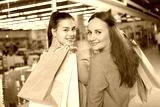 Happy female friends carrying shopping bags, smiling to the camera while walking at the mall