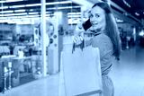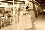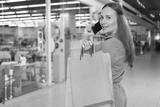 Rear view shot of a beautiful woman looking to the camera, talking on her phone while shopping at the mall. Consumerism, urban lifestyle concept