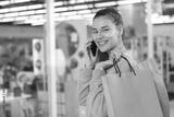 Attractive young woman carrying shopping bags at the mall, talking on the phone, copy space