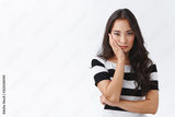 Bored and unamused young asian brunette female in striped t-shirt dying from boredom, hold hand on face and stare uninterested and reluctant, standing white background annoyed
