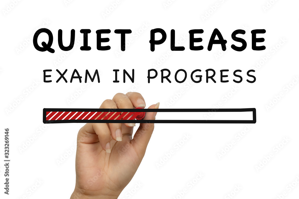 Quiet please exam in progress handwritten poster banner on white background with loading bar - Student examination school college university notice - Evaluation patient test doodle style sign concept