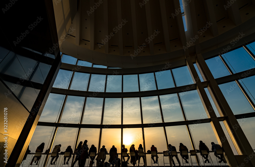 People silhouette inside Observation Deck. Tokyo, Japan.