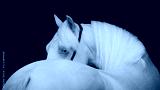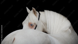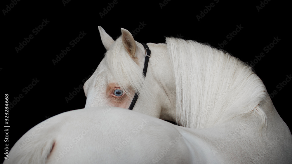 Portrait of a beautiful white Arabian horse with long mane looks back on black background isolated, head closeup.
