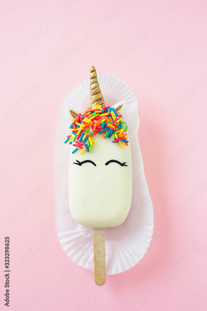 Unicorn popsicle with closed eyes on a pink background. Glazed with white chocolate..