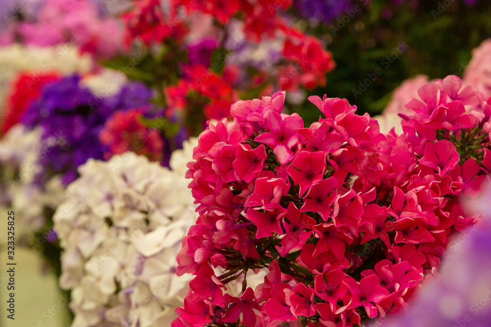 Close up of blooming Phlox paniculata. Summer garden, flowers on the street, flowerbed.