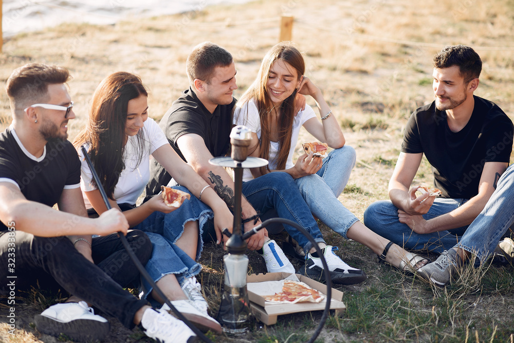 Group of friends is sitting near the lake. They wear casual clothes. Young people eat pizza outside.