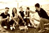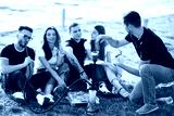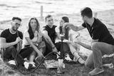 Group of friends is sitting near the lake. They wear casual clothes. Young people eat pizza outside.