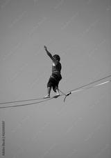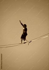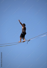 Akrobata spacerujący po linie zawieszonej na dużej wysokości na tle niebieskiego niba
