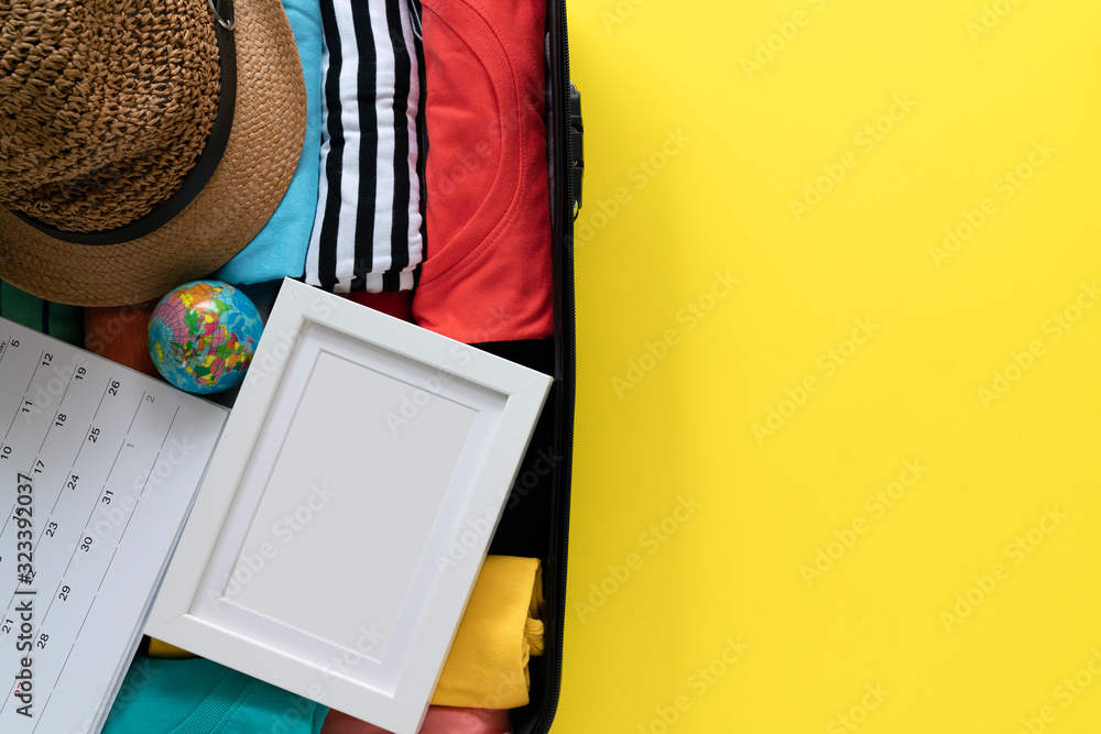 packing a luggage for a new journey and travel for a long weekend on yellow table background