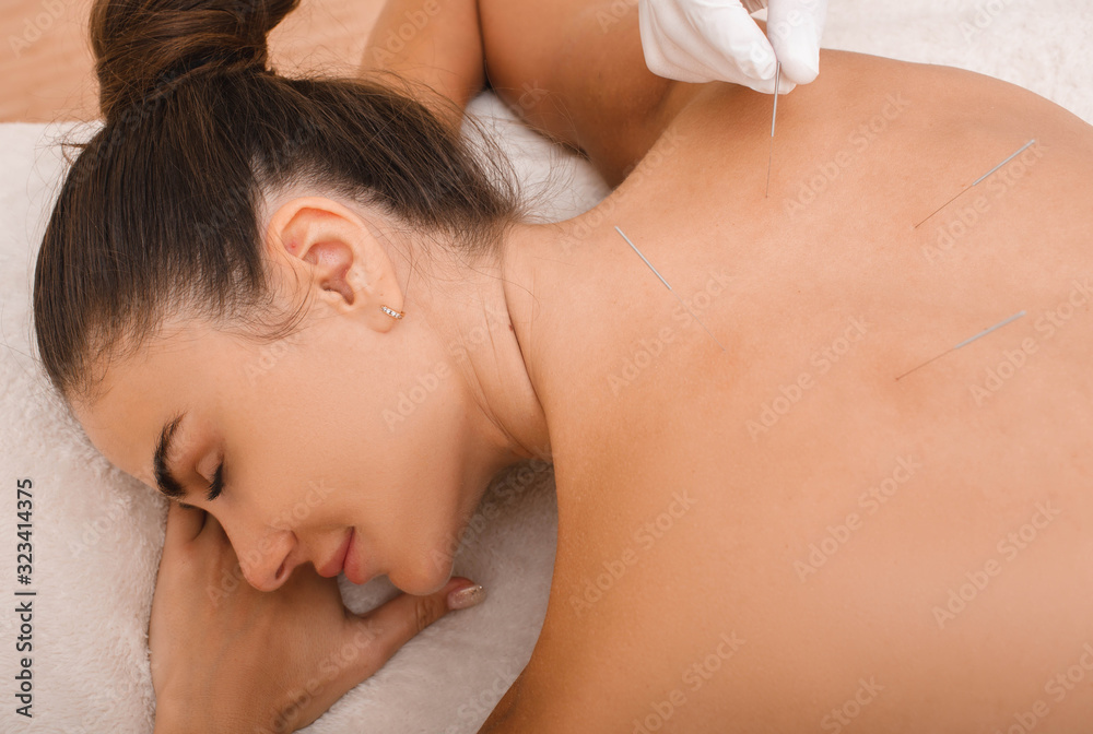 Woman enjoys the acupuncture procedure. acupuncturist doing acupuncture very accurately. Needle close up