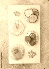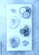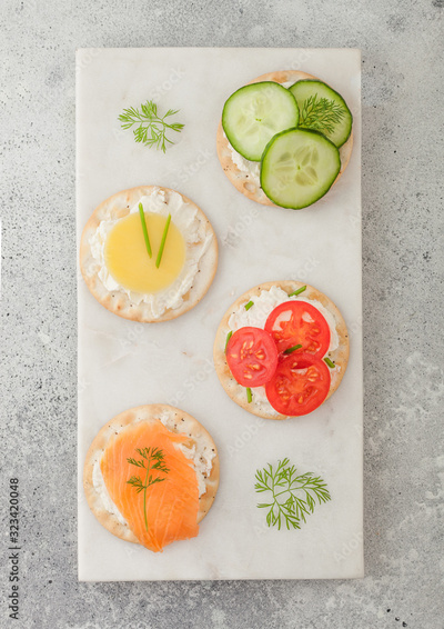 Various round healthy crackers with salmon and cheese, tomato and cucumber on marble board on light kitchen table background.