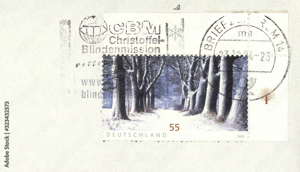 Briefmarke stamp Deutschland Germany gestempelt used frankiert Winter Landschaft Schnee 55 slogan Werbung CBM Christoffel-Blindenmission Post letter mail Brief 2004