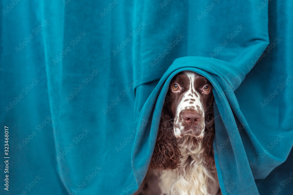 The dog is hiding behind the curtains from the owner, because it ruined his household things.