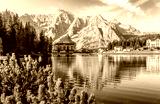 Beautiful Summer sunny landscape. Wonderful view on Misurina Alpine lake in morning. National Park Tre Cime di Lavaredo, Auronzo, Dolomites Alps, South Tyrol, Italy, Europe. Nature background