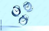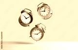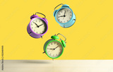 Multicolored alarm clocks flying over the table on yellow background. Copy space