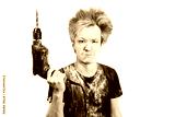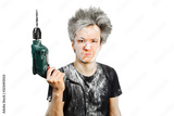 Dirty young builder guy in plaster is hold a green drill perforator on isolated background at home during repairs