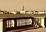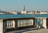 Balustrade in front of Campanile and Doge palace in Venice on a sunny day in winter