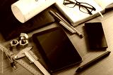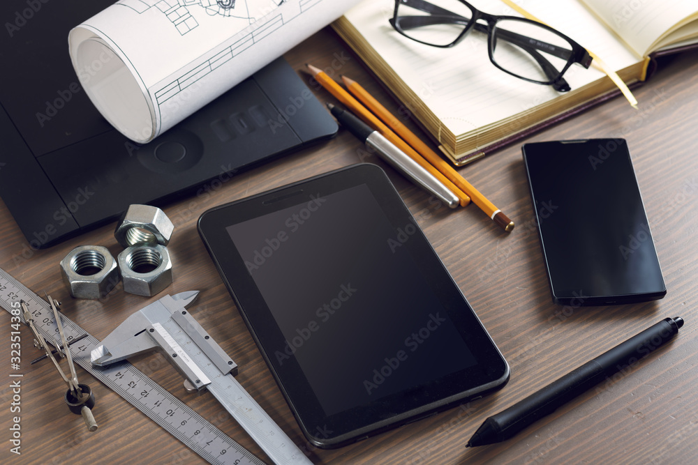 Workplace of an engineer, designer. Tablet computer, phone, vernier caliper, drawings.