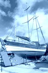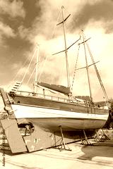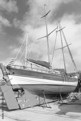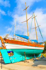 Traditional wooden sail boat in shipyard of small Greek marina, Samos island, Greece