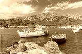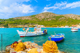 Colourful Greek fishing boats with nets on shore in Posidonio bay, Samos island, Greece