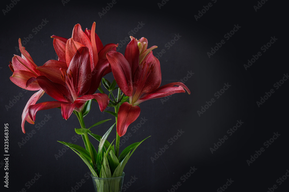Beautiful Red Asiatic Lilies Against a Dark Background with Copy Space, Horizontal