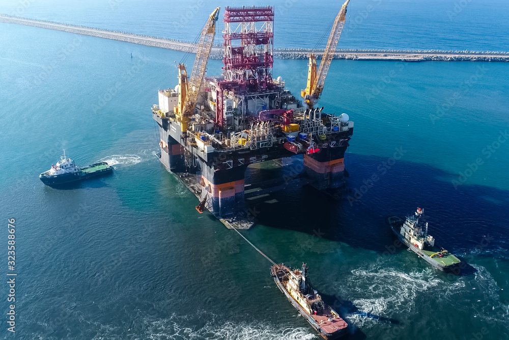 Drilling platform in the port. Towing of the oil platform