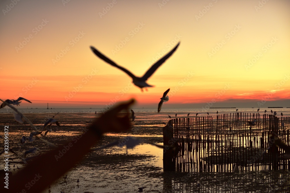 A group of seagulls flying in the colorful sky of the sea before dusk