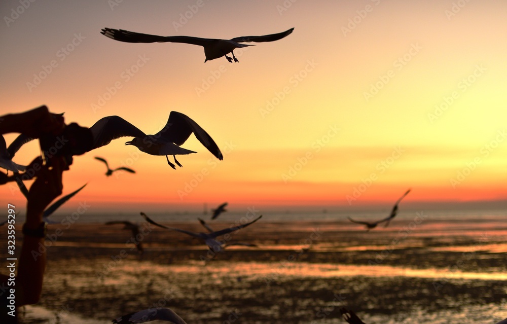 A group of seagulls flying in the colorful sky of the sea before dusk