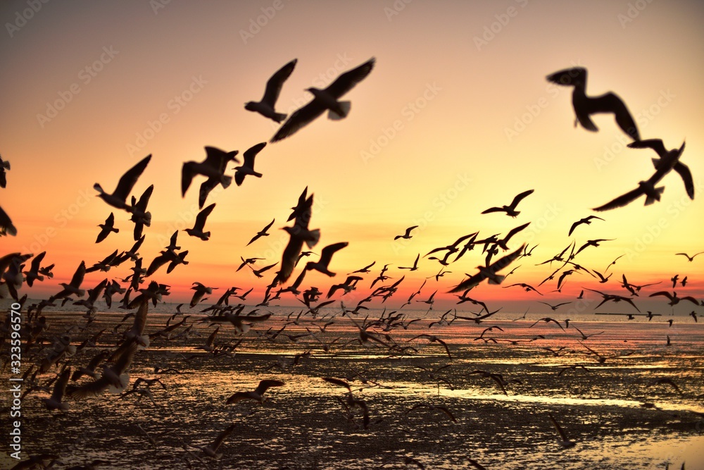 A group of seagulls flying in the colorful sky of the sea before dusk