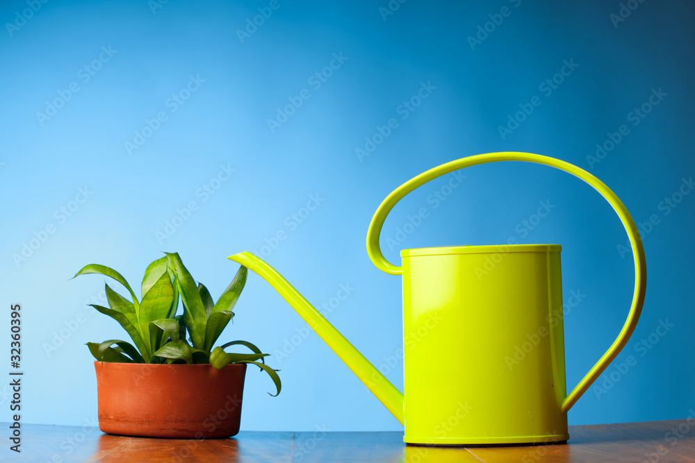 watering can and plant on blue background