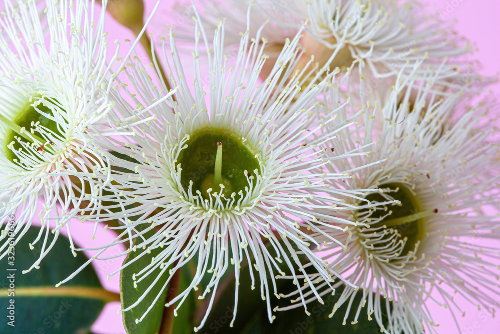 Blooming eucalyptus flowers extreme closeup on pink background