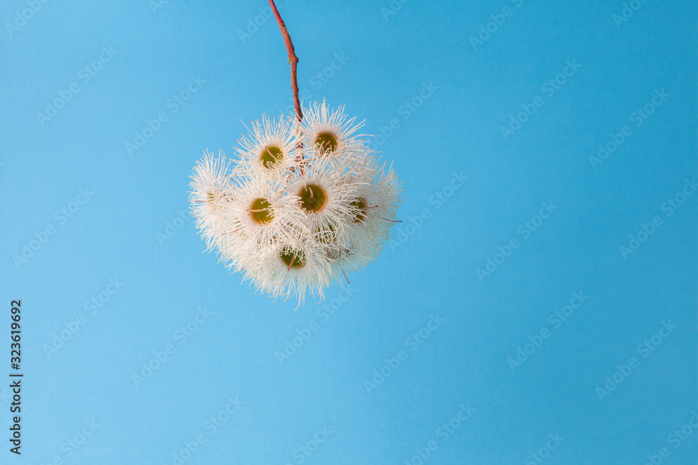 White eucalyptus flowers hanging on a branch on blue background with copy space