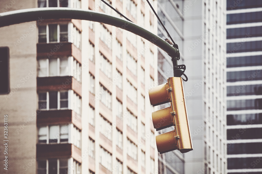 Traffic light in New York City, selective focus, color toning applied, USA.