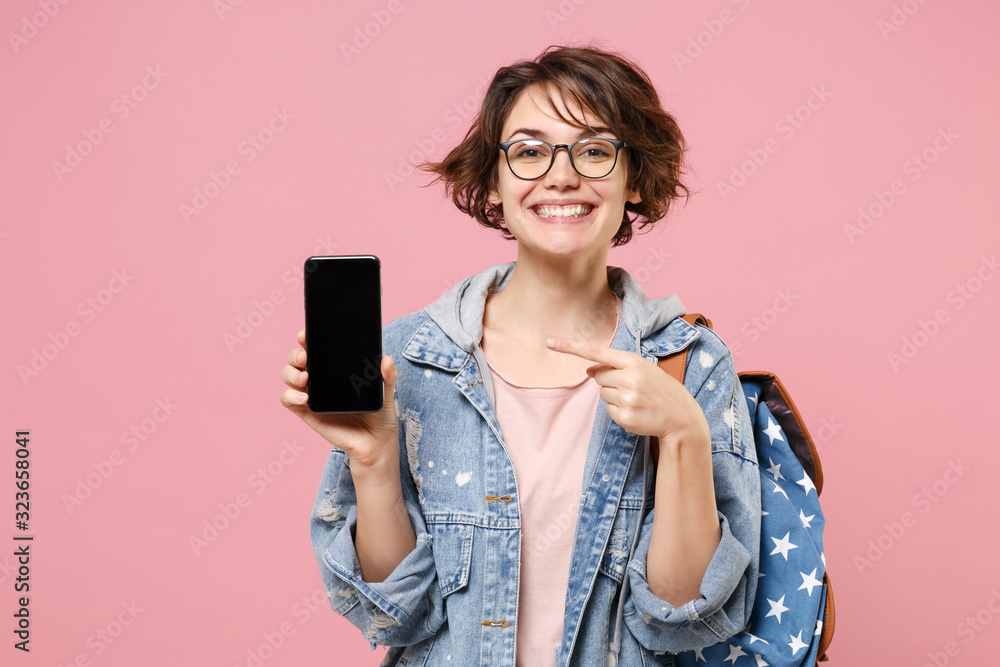 Smiling woman student in denim clothes glasses backpack isolated on pastel pink background. Education in high school university college concept. Point finger on mobile phone with blank empty screen.