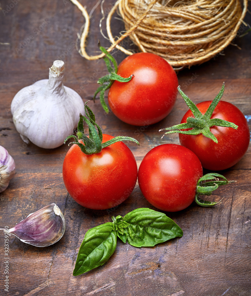 Harvest tomatoes spicy herbs and spice at old board in rustic style.