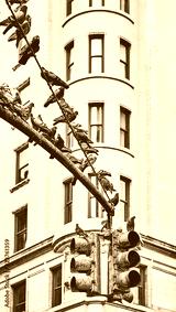 Traffic light post with pigeons in New York City, color toned picture, USA.