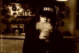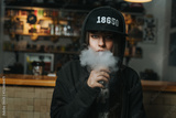 Young pretty woman in cap smoke an electronic cigarette at the vape shop. Hip-hop style. Closeup.