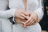 wedding guy and girl in a white dress holding hands on fingers wedding rings